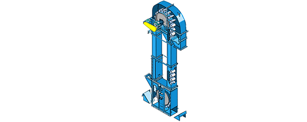 斗式提升機或斗式輸送機由運行部分(料斗與牽引膠帶),帶有傳動滾筒的上部區段,帶有拉緊滾筒的下部區段,中間機殼,驅動裝置,逆止制動裝置等組成,適用于向上輸送松散密度ρ<1.5t/m3粉狀、粒狀和小塊狀的無磨琢性和半磨琢性散狀物料,如煤、砂、焦末、水泥、碎礦石等。